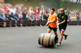 v běhu na 600 metrů s dřevěným pivním sudem, který závodníci